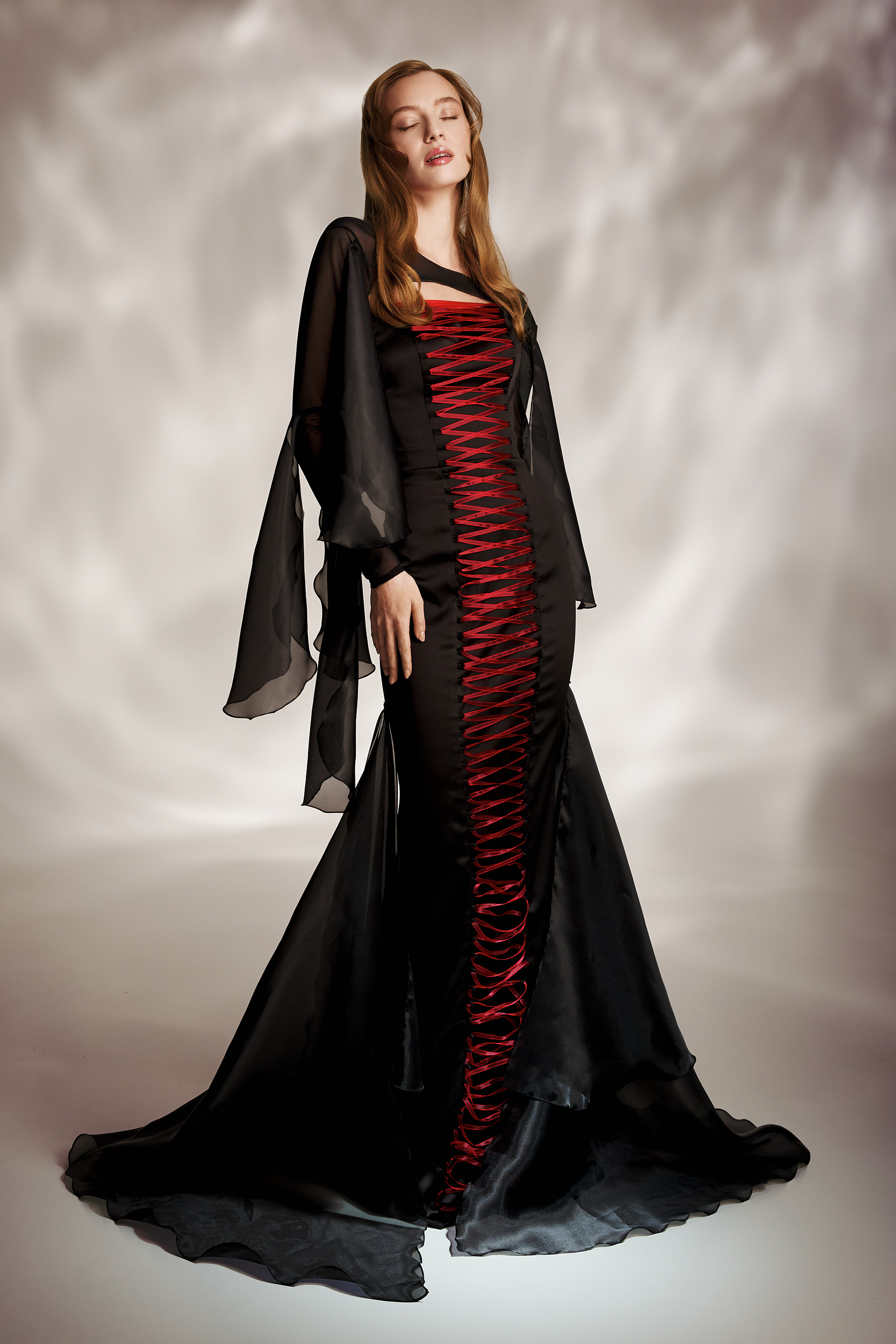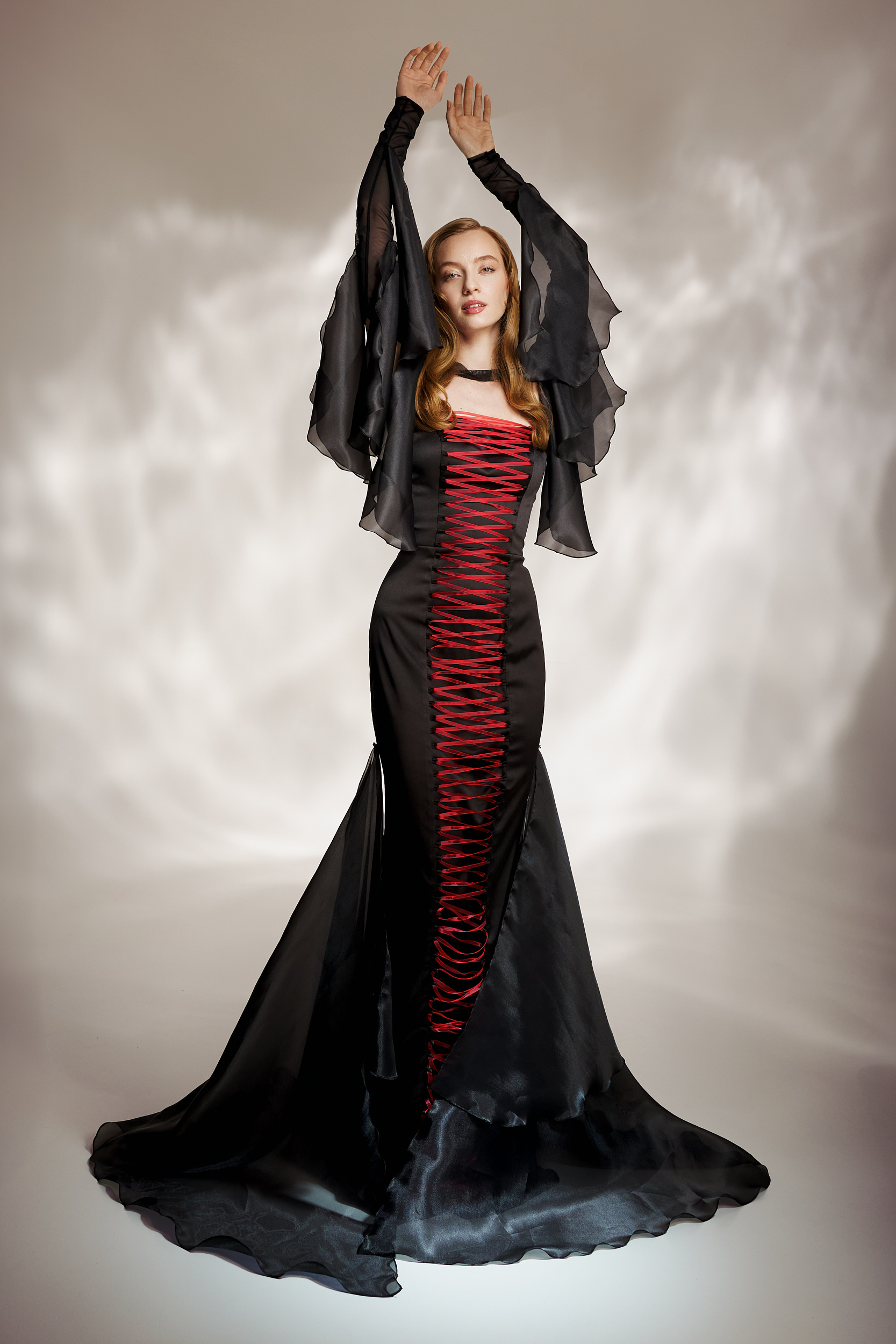 Rochie de ocazie couture, ce îmbină eleganța clasică a negrului cu accente dramatice roșii. Corsetul structurat modelează silueta, iar capa cu volane din organza și trena completează un look spectaculos.