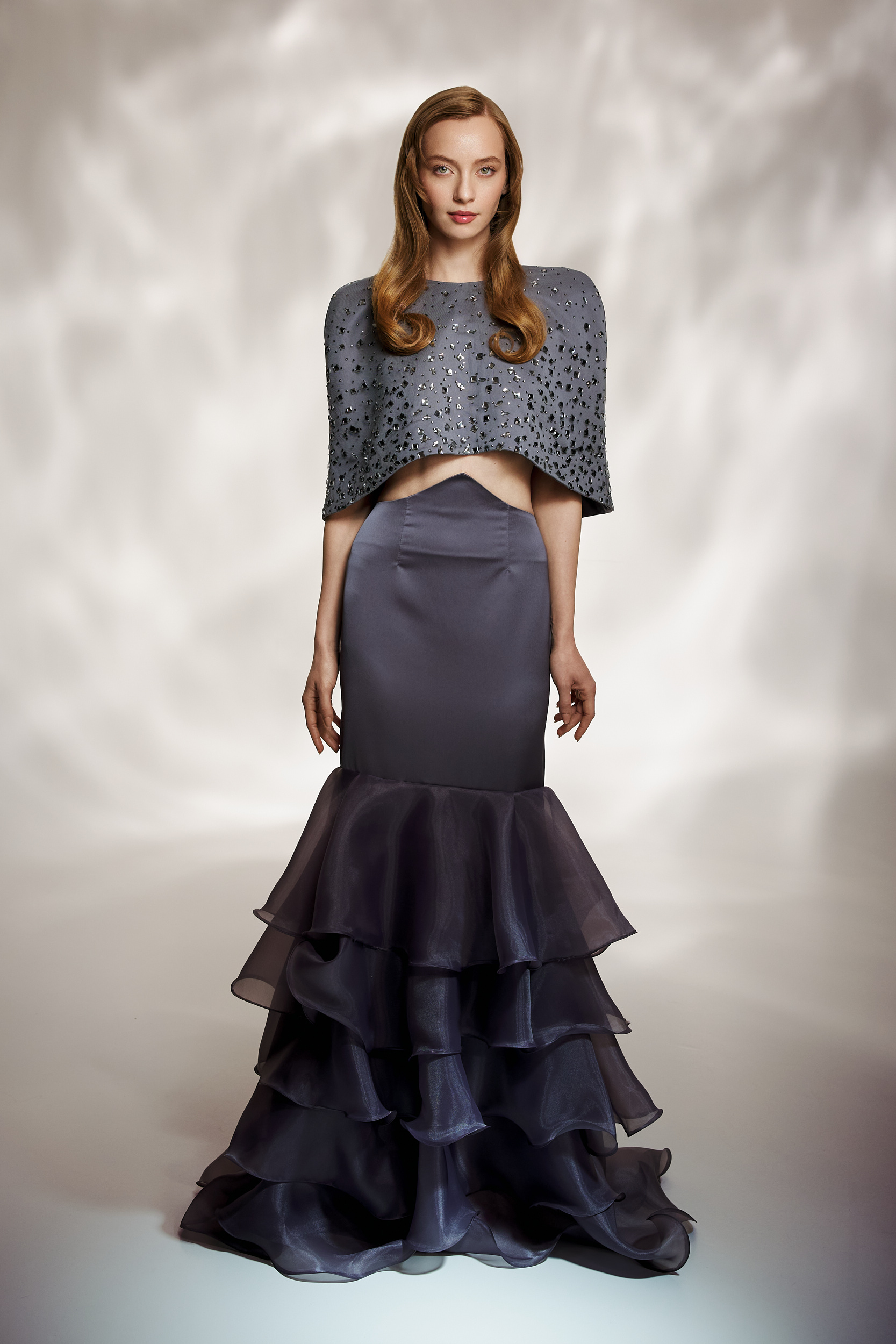 Rochie de gala realizată din trei piese, ce îmbină texturi rafinate și detalii couture. Capa din tafta este decorată manual cu plasă cu pietre, fusta este amplă, cu volane din organza, iar bustiera oferă susținere prin cupe cu push-up discret.