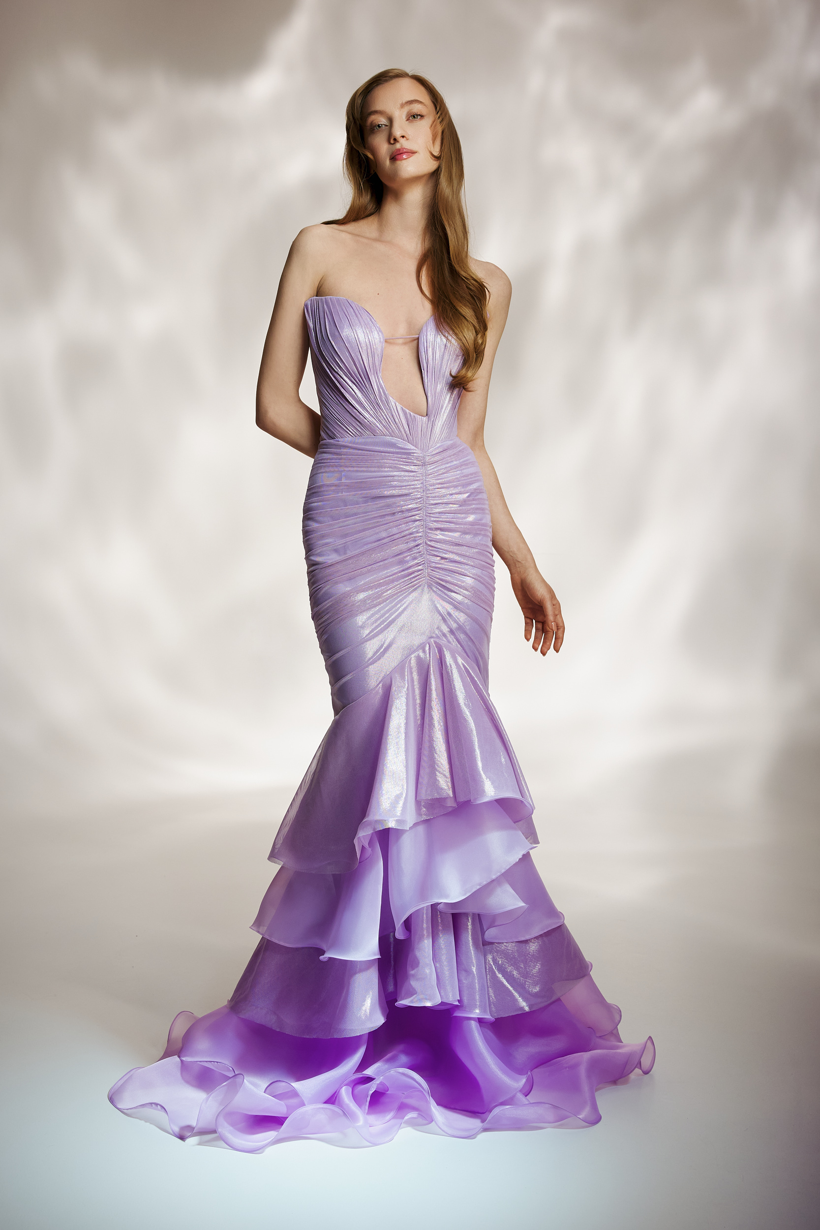 Rochie de gală couture într-o nuanță sofisticată de mov, realizată prin tehnici meticuloase de drapare manuală, ce conturează elegant silueta. Designul este construit pe un corset din tafta premium, ușor elastică, prevăzut cu balene pentru susținere și definirea taliei.